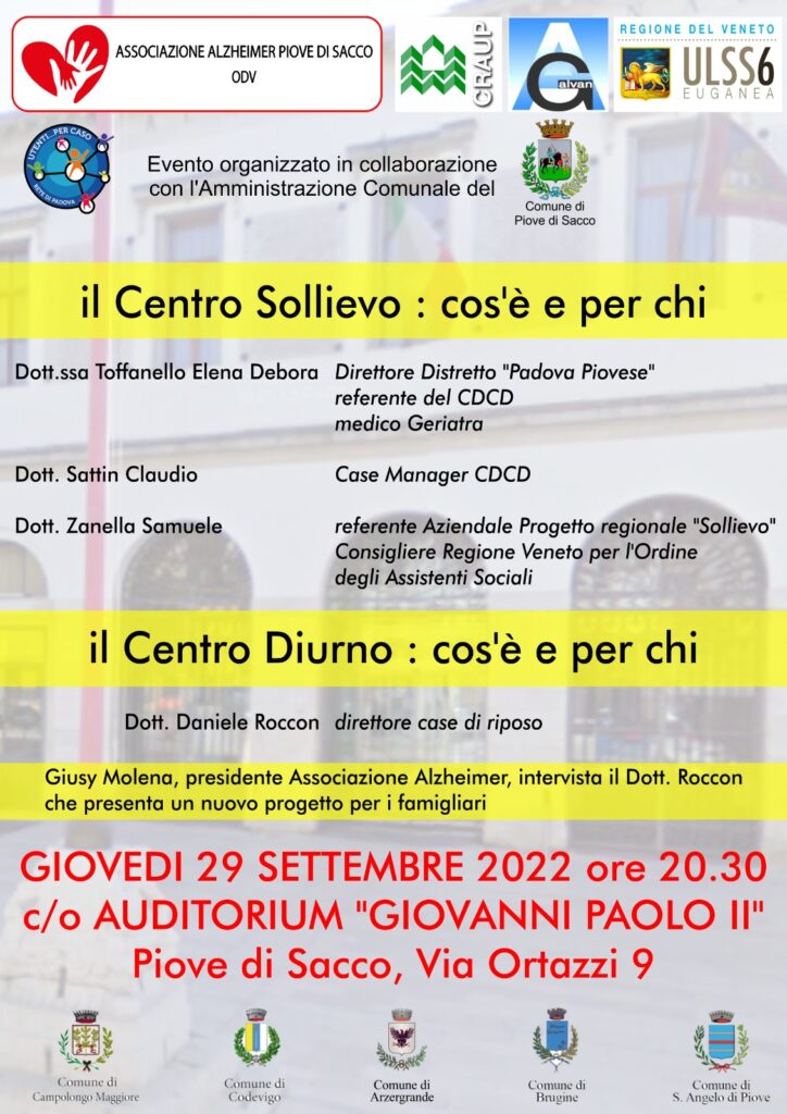 Giovedì 29 settembre alle ore 20.30 presso l’Auditorium “Giovanni Paolo II” di Piove di Sacco, in Via Ortazzi, 9 si parlerà di Centro Sollievo e Centro Diurno con l’intervento di molti specialisti.
